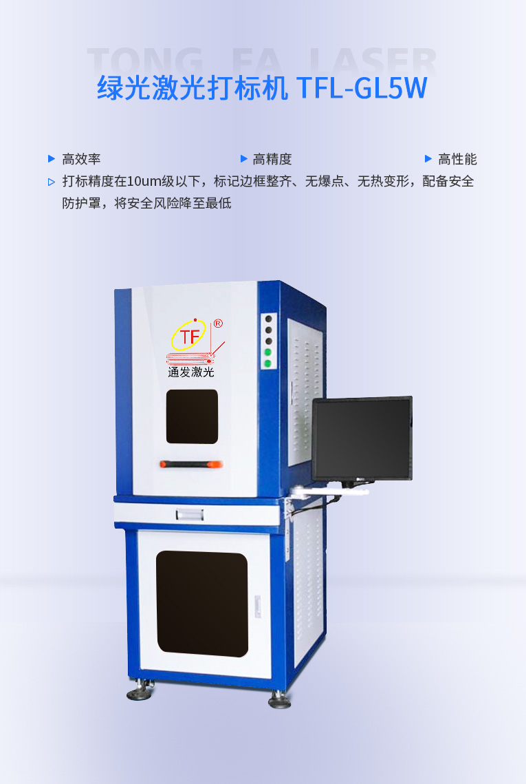 通發(fā)激光研發(fā)的TFL-GL3W/5W 綠光激光打標機配備安全防護罩,避免設備操作員誤操作引起的人身傷害,將安全風險降至最低,產(chǎn)品遠銷海內(nèi)外.打標精度在10μm級以下,標記邊框整齊、無爆點、無熱變形,有效提高加工的成品合格率,使用壽命長、配合全封密光路、特別加固的光路底座滿足長期、穩(wěn)定性的工作需要。